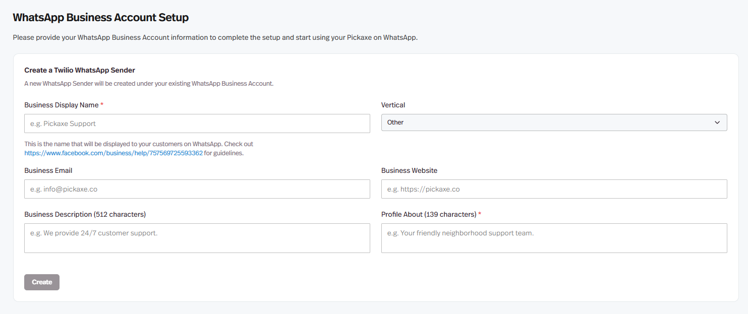 Once approved, choose your phone number’s country and fill out the information to create a Twilio WhatsApp Sender.
